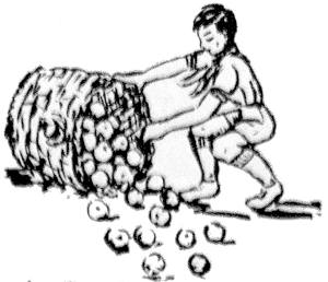 szétszórt gyümölccsel. Odasietett és kezdte felszedni a narancsokat, hogy az